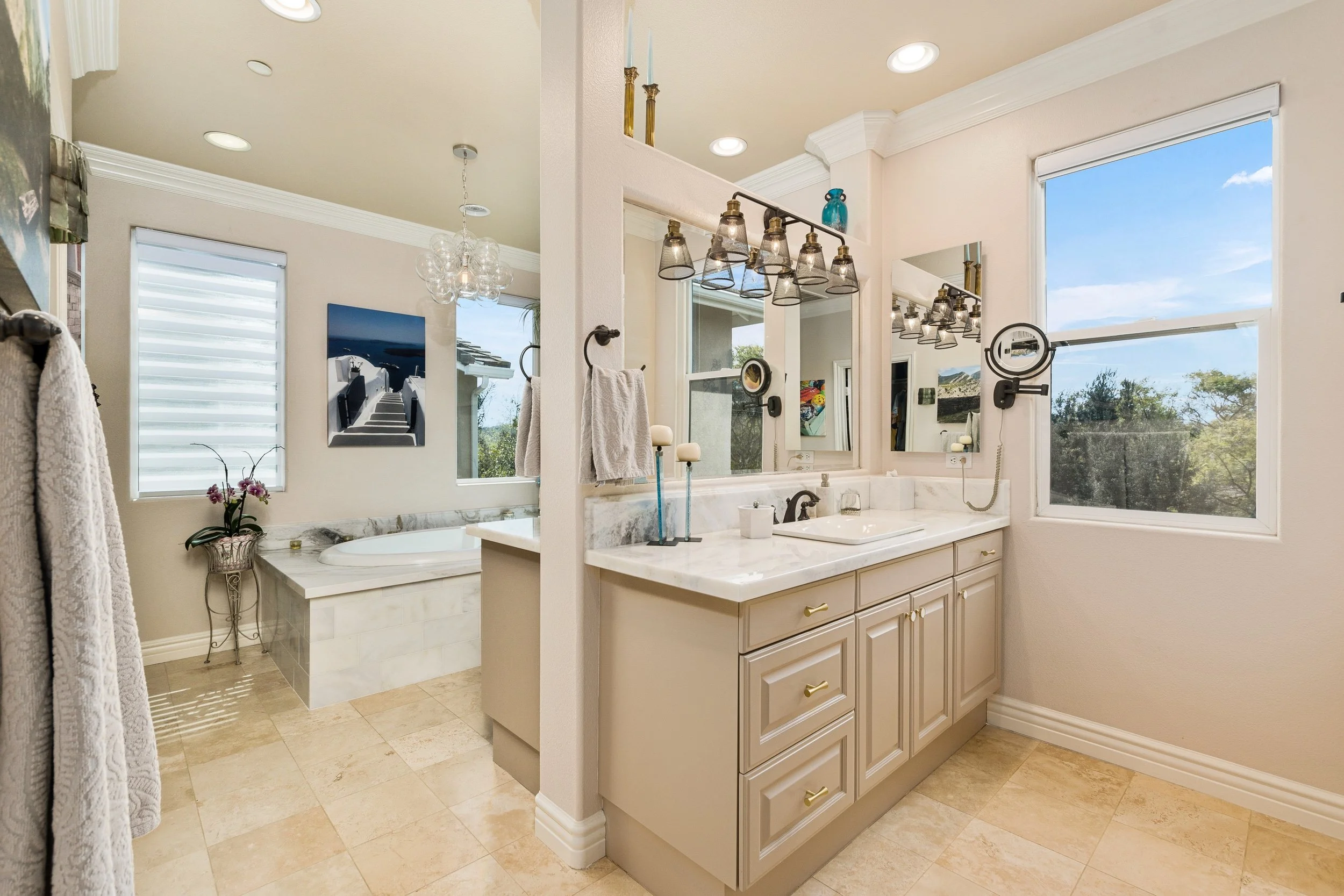 4S Ranch Transitional Primary Bathroom with Marble Covered Built-in Tub